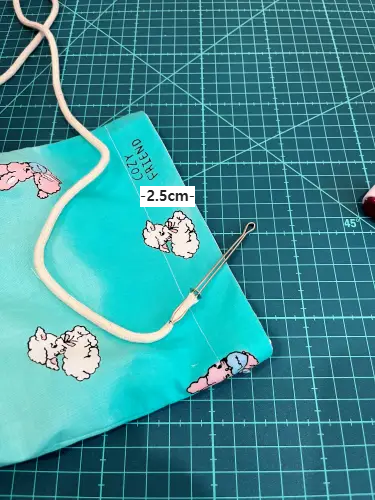 예쁘게 다듬었으면 이제 파우치 입구에서 2.5cm 간격으로 재봉하고 양쪽 구멍에 끈을 넣어 완성해 줍니다.