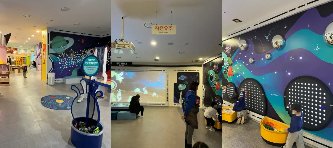 우주를 테마로 여러가지 연계활동도 할 수 있는데요. 그림을 그려서 우주로 보내보고 색색깔 다양한 교구들을 활용해서 꾸며보는 등 흥미로운 놀거리들이 많았습니다.
